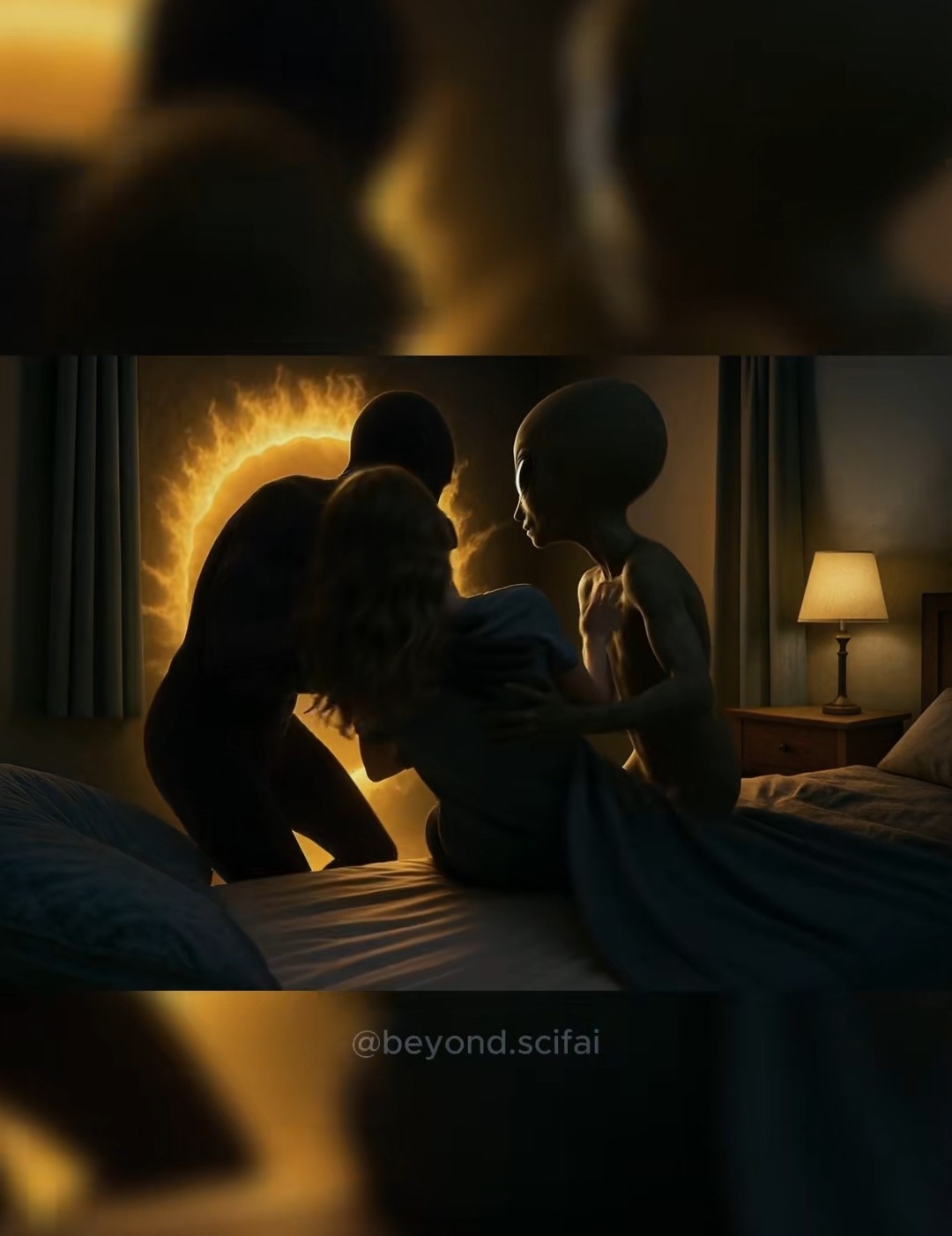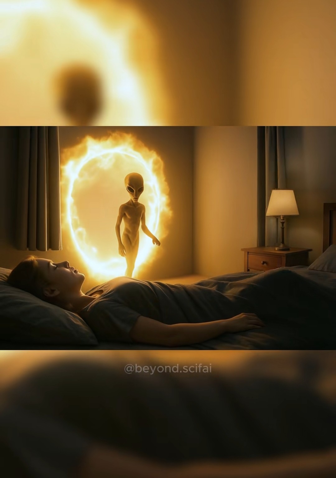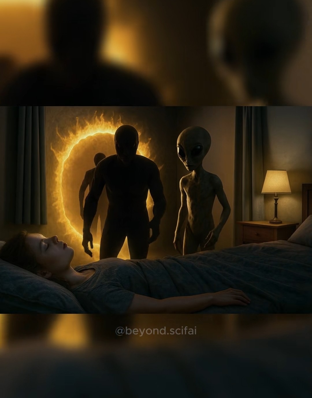 القصة الأولى في إحدى الليالي فتحت بوابة طاقية في منتصف غرفة نومها وظهرت كائنات ثلاثية الأبعاد ظلية لأخذها تحت اشراف كائن رمادي تصفه بالمشرف
